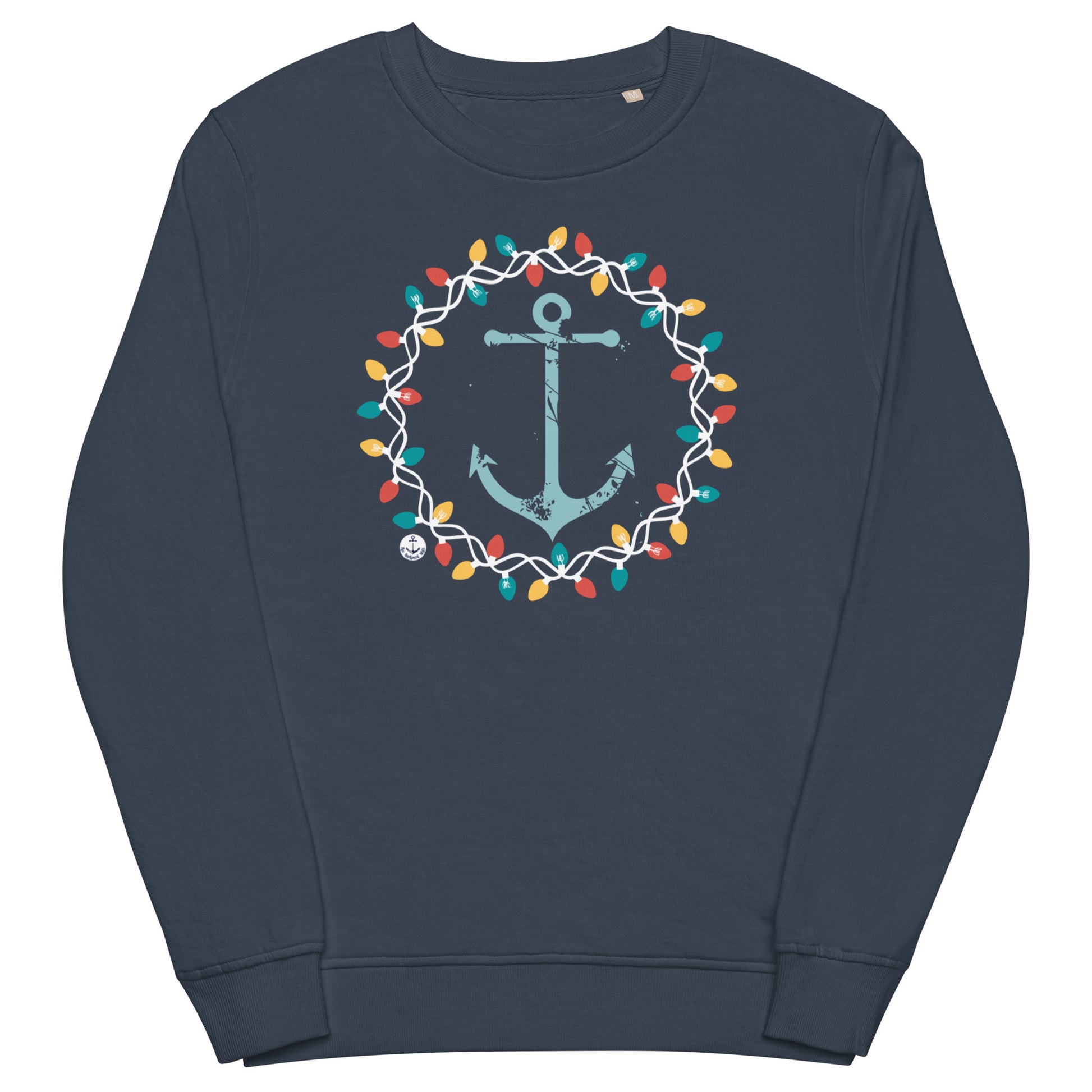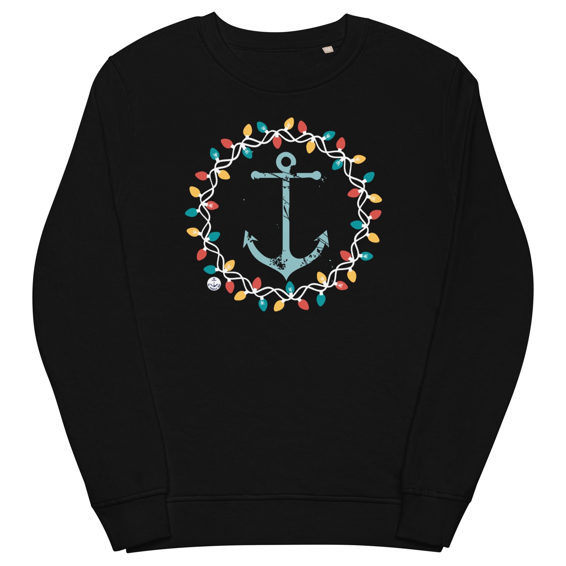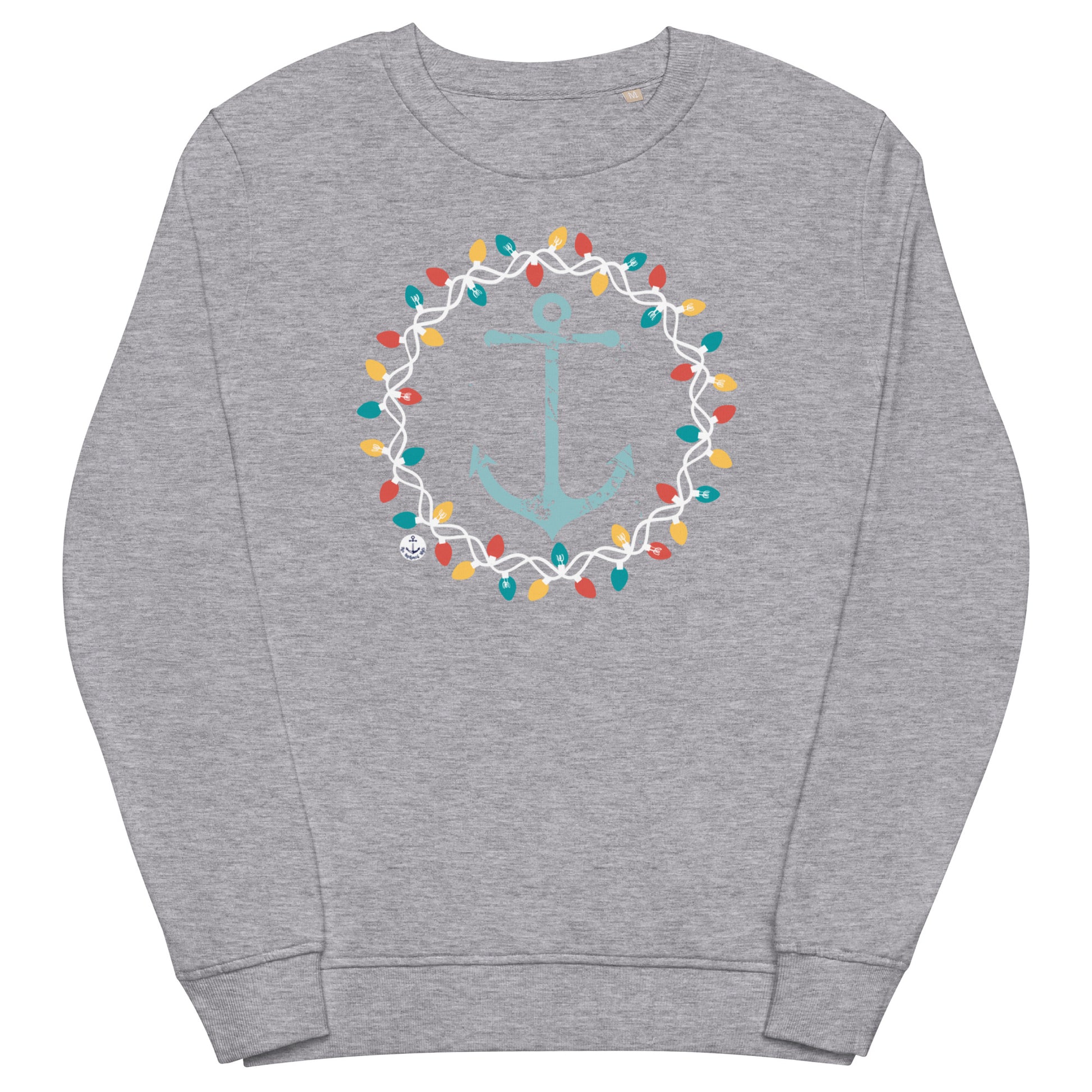 Make prepping for the holidays nautically festive with our Christmas Wreath Anchor lake sweatshirt. The design features a distressed anchor surrounded by a colorful wreath of Christmas lights on the front of the sweatshirt.